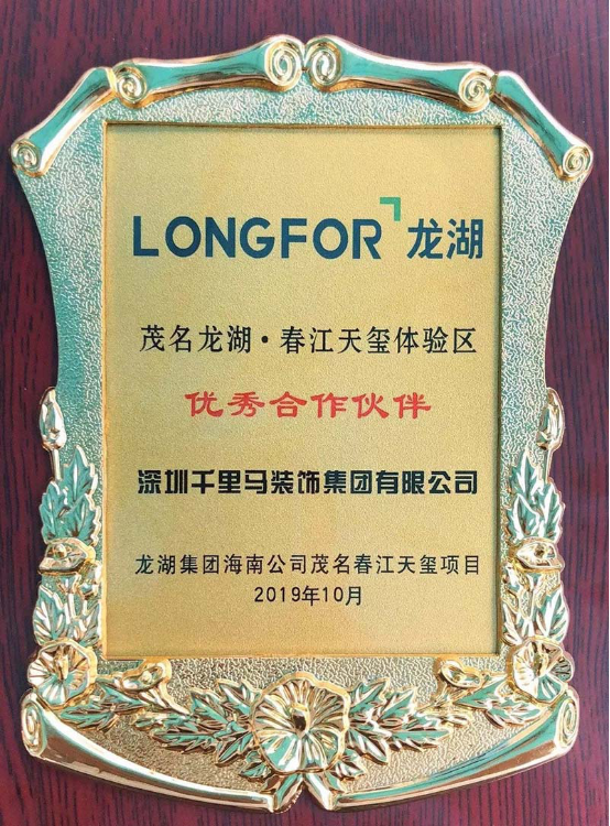 龍湖·春江天璽是龍湖集團首入茂名打造的主城最高端品質(zhì)酒店式尊享社區(qū),深圳千里馬裝飾集團作為承建單位不負眾望,將其營銷中心體驗區(qū)及樣板房建設(shè)得盡善盡美,無其倫比。因此,龍湖集團授予深圳千里馬裝飾集團“優(yōu)秀合作伙伴”獎牌以示感謝。
