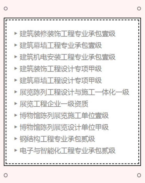 現在,深圳千里馬裝飾集團已經形成以建筑裝飾裝修工程為核心,建筑幕墻工程、智能化工程、鋼結構工程、展陳工程等領域齊頭并進的格局,是集策劃、設計、施工、軟裝為一體的裝飾整體服務提供商。現持有資質如下: