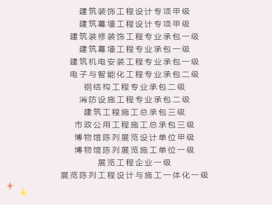 近期,深圳千里馬裝飾集團(tuán)資質(zhì)建設(shè)喜訊頻傳,集團(tuán)陸續(xù)取得了“建筑工程施工總承包三級(jí)”、“市政公用工程施工總承包三級(jí)”、“消防設(shè)施工程專業(yè)承包二級(jí)”、“博物館展陳設(shè)計(jì)甲級(jí)與施工一級(jí)”等多項(xiàng)資質(zhì)。資質(zhì)的全面升級(jí),意味著集團(tuán)資質(zhì)體系的逐漸完善。